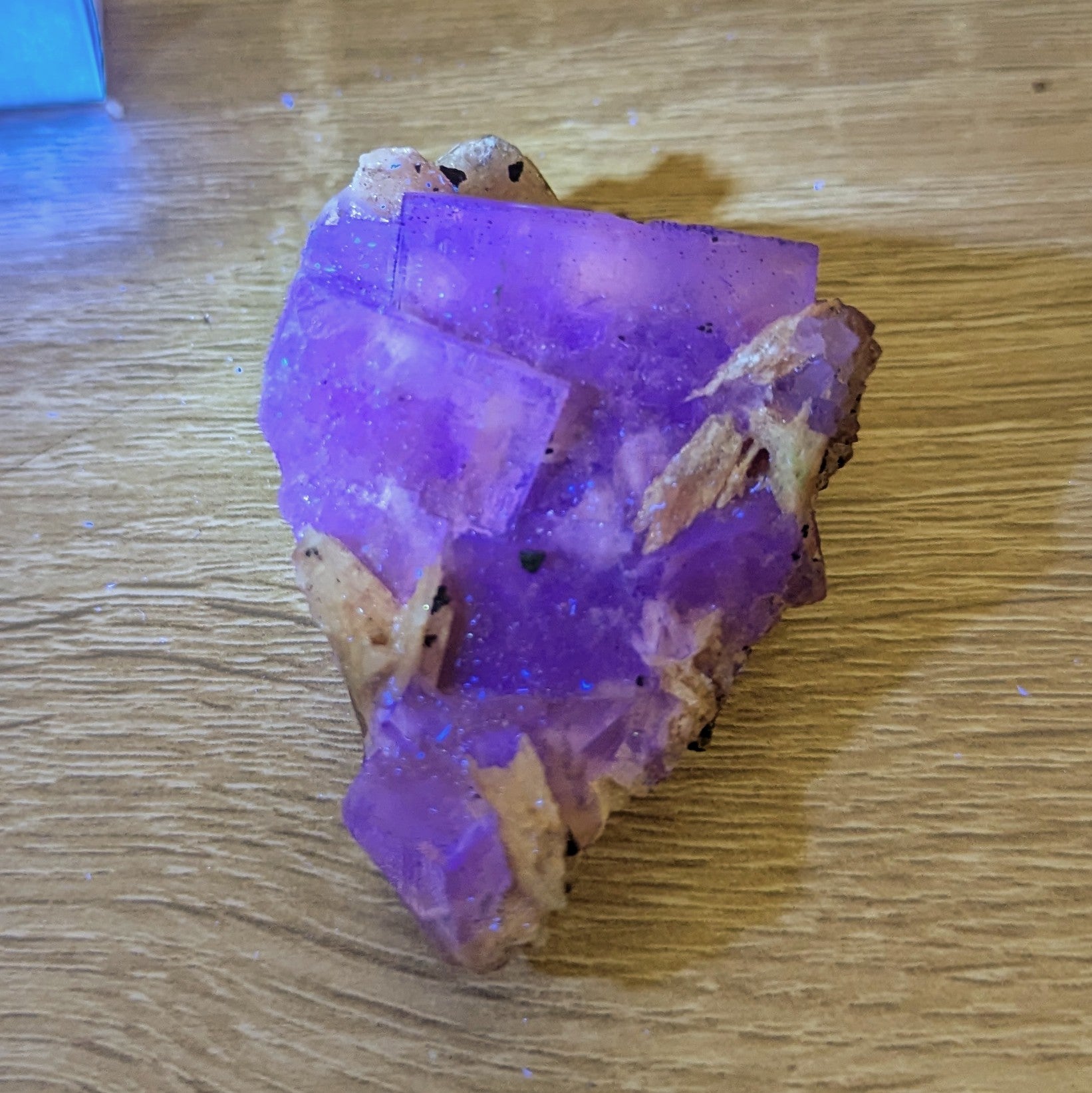 Fluorite with Baryte association and inclusions! UV reaction is pinkish.