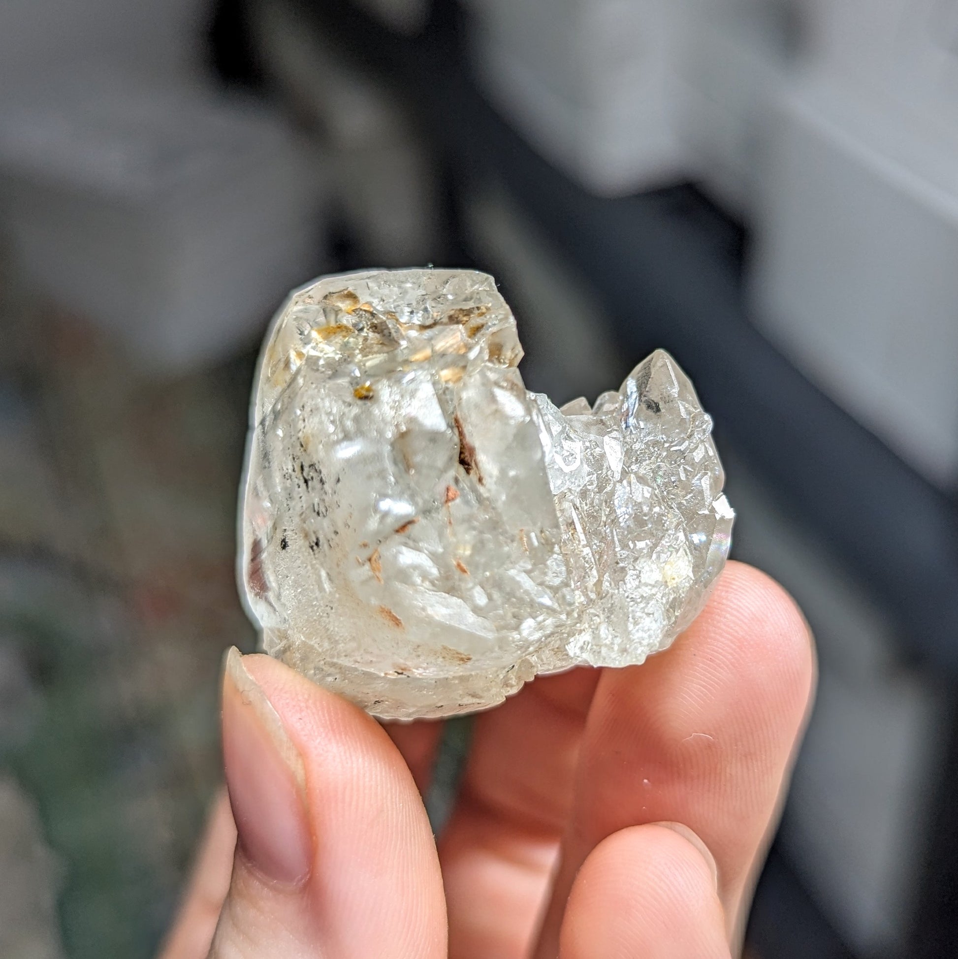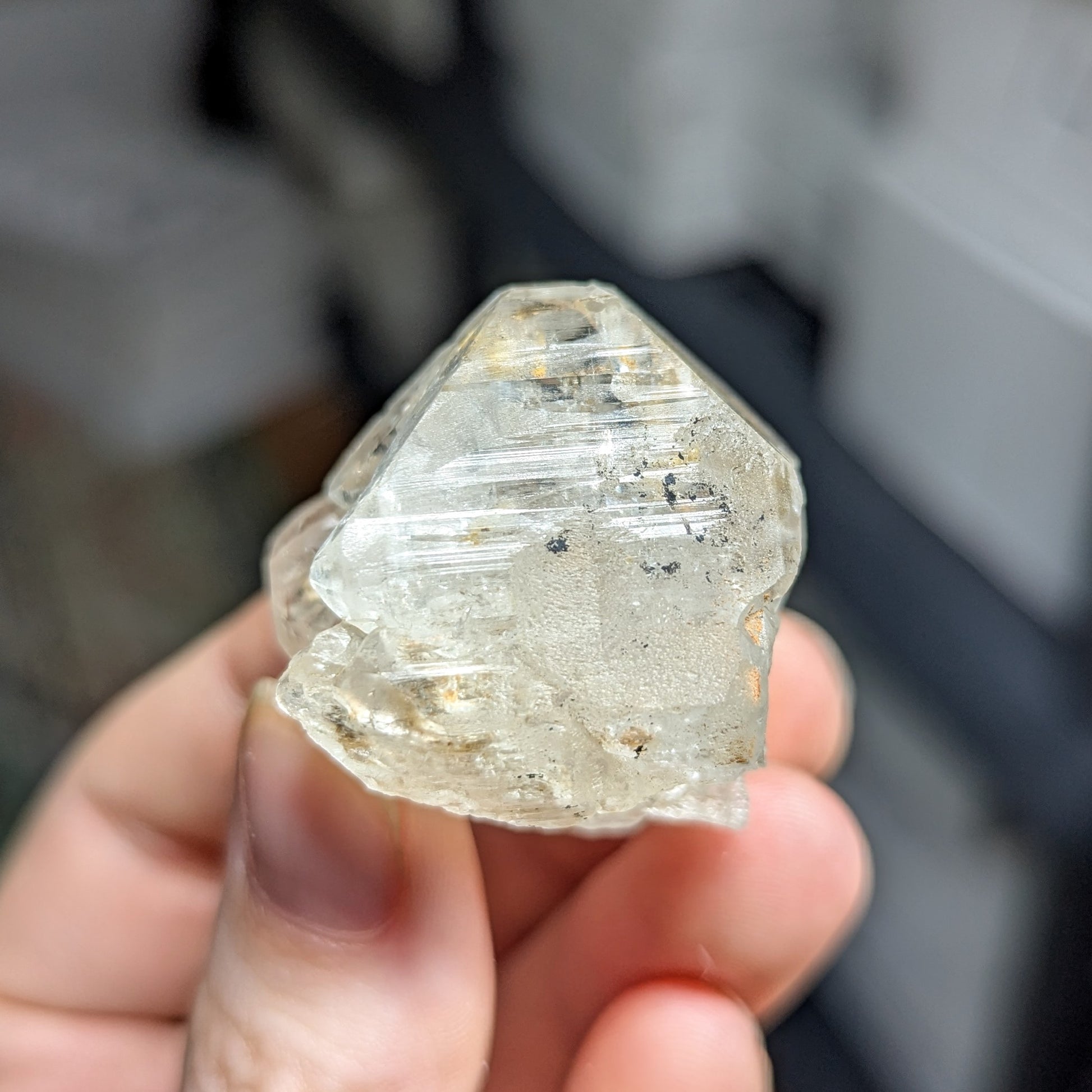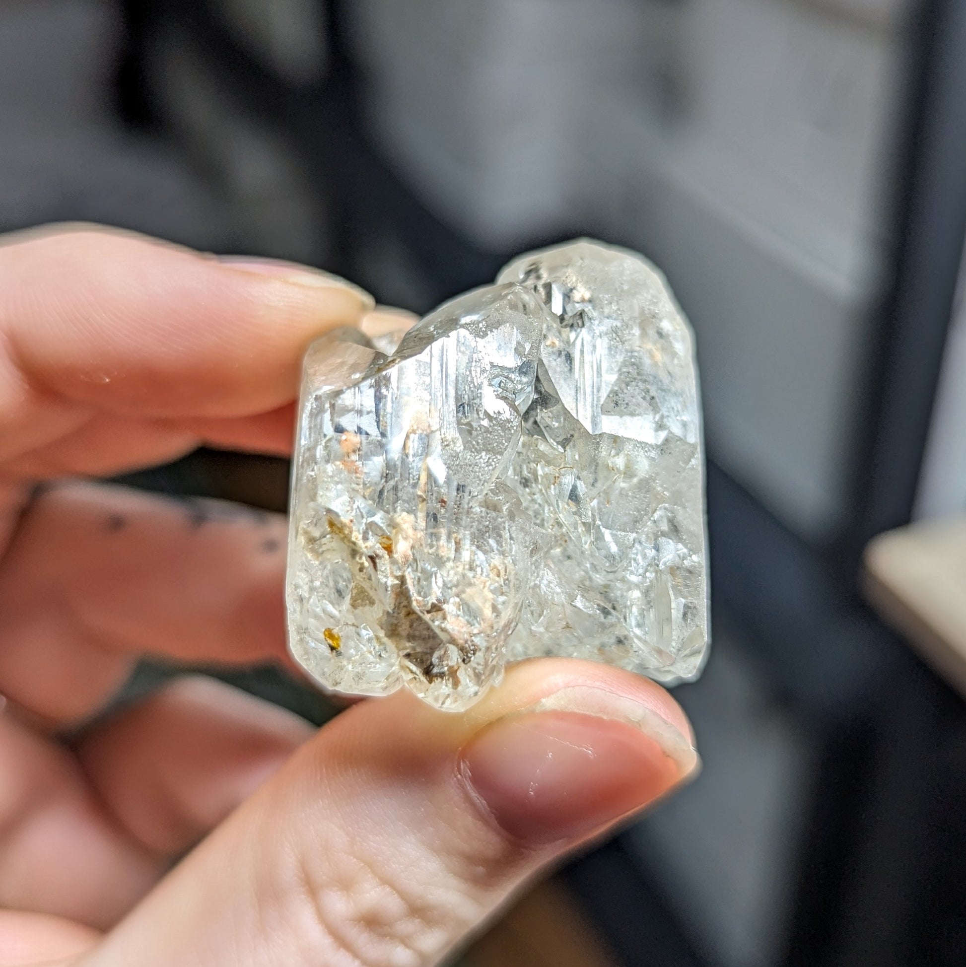 Clear, Etched Topaz. May have an Enhydro although I couldn't find one upon initial inspection, however this is not affecting the price