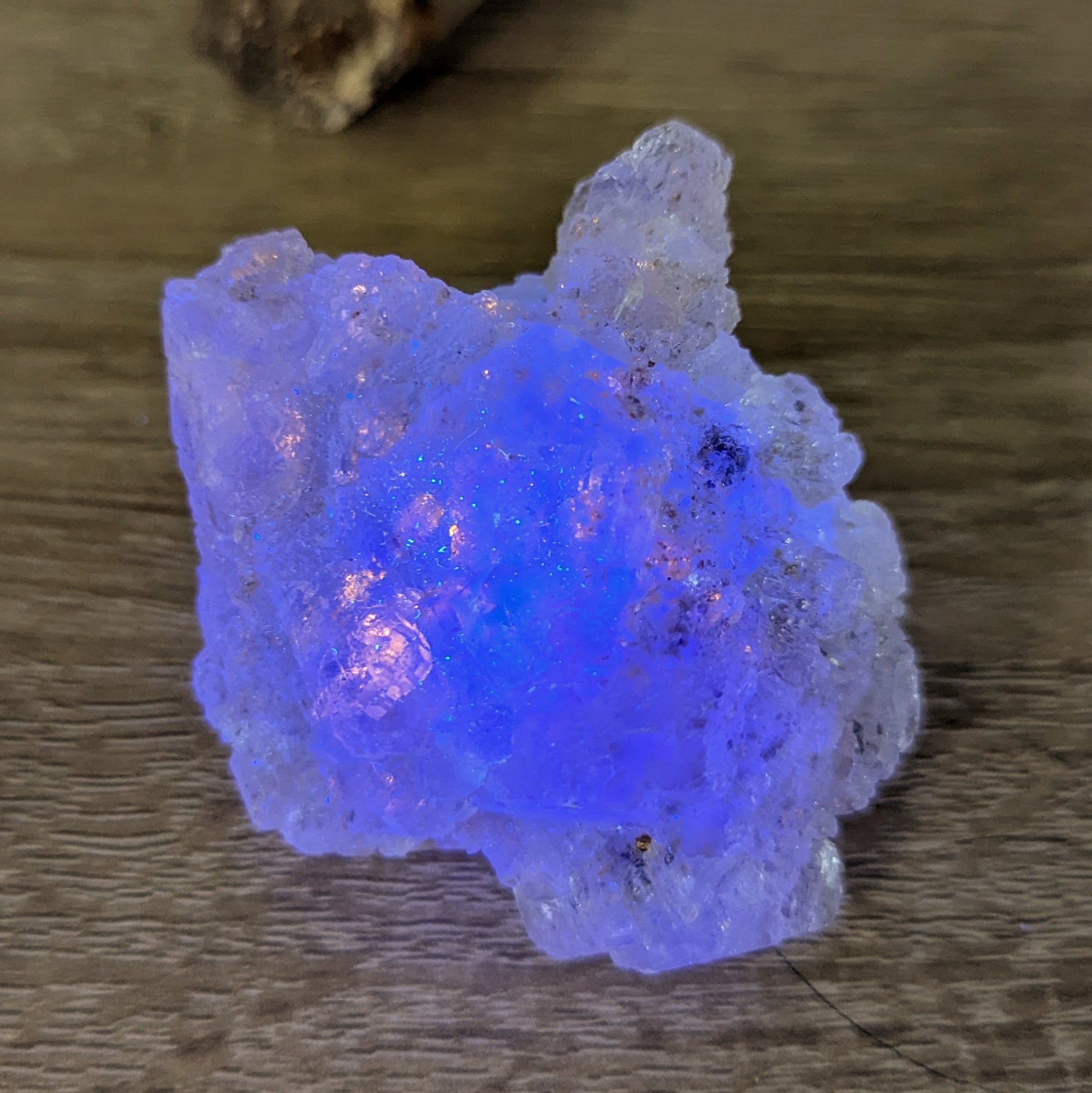 Clear Etched Fluorite with a Pink Core. This one has a single miniature Quartz point coming out of it, and some inclusions that UV react bright orange!