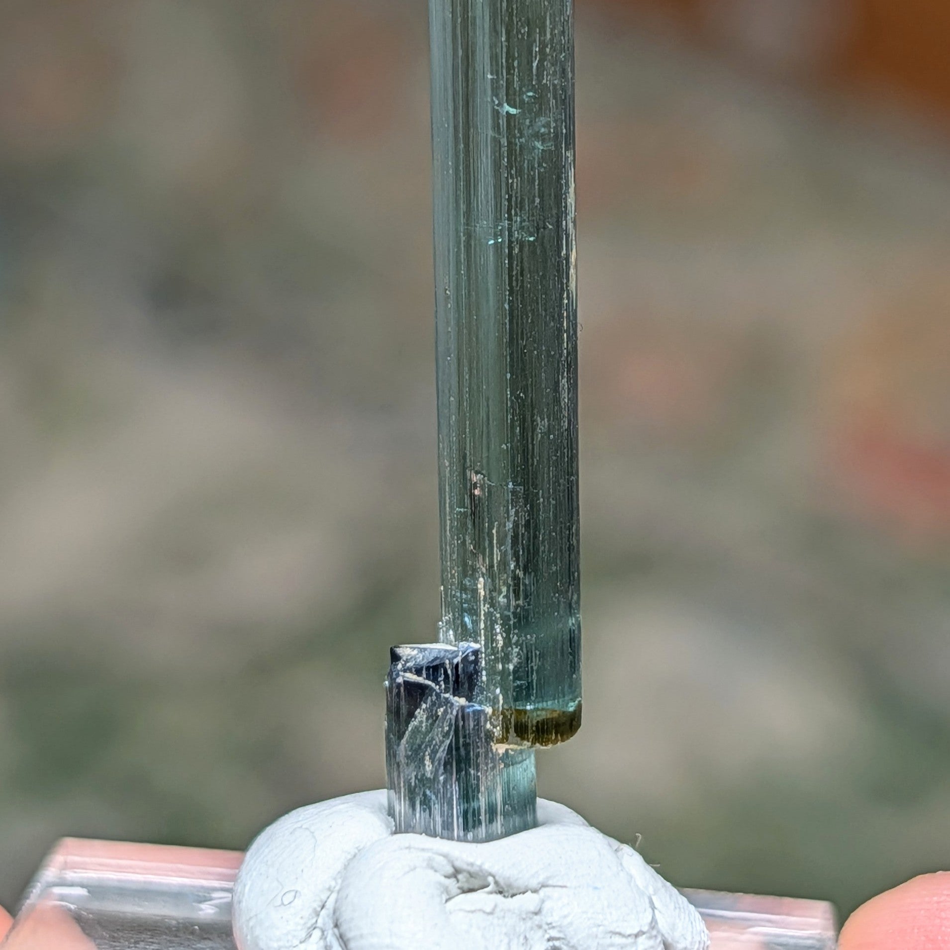 This Blue Tourmaline grew, stopped and terminated with a yellow cap, then started up again and Terminated with a Purple Cap!